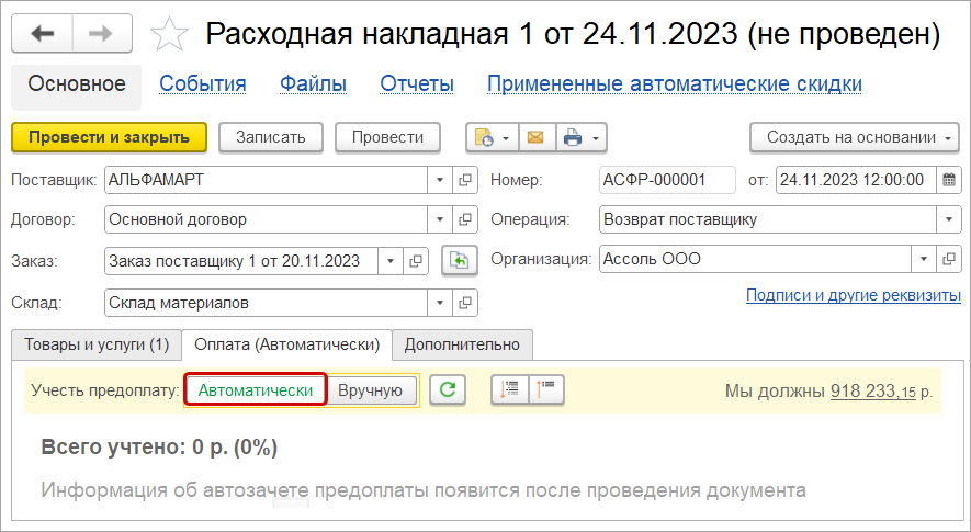 Переходим на вкладку "Оплата". По умолчанию для новых документов включен режим "Автоматически".