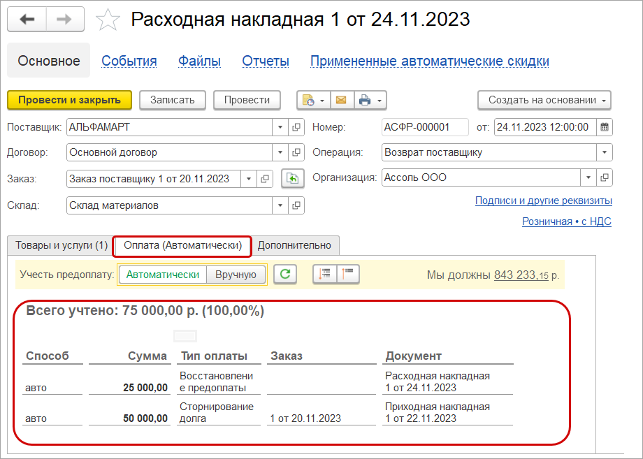 Проводим документ. На вкладке появляется информация об уменьшении долга и авансе на общую сумму возврата в 75 000 руб.