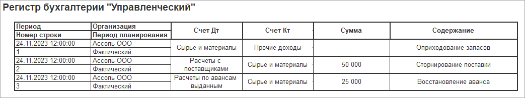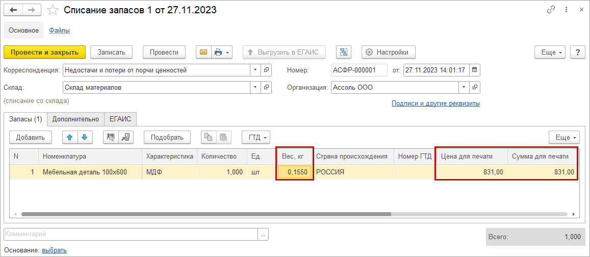 После включения они появятся в табличной части "Запасы". Все цены указываются справочно только для печатных форм и не используются в движениях документа.