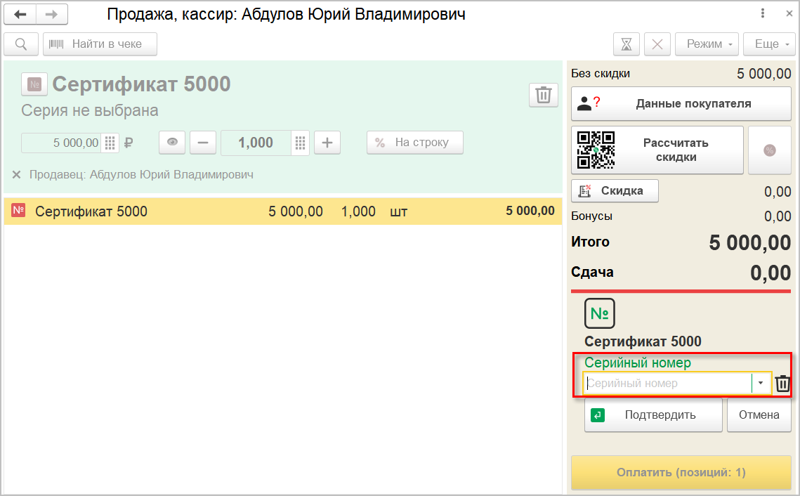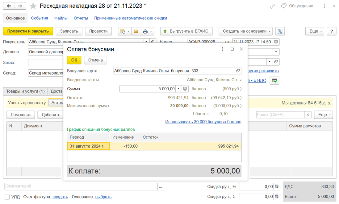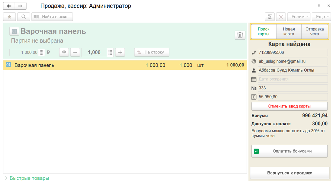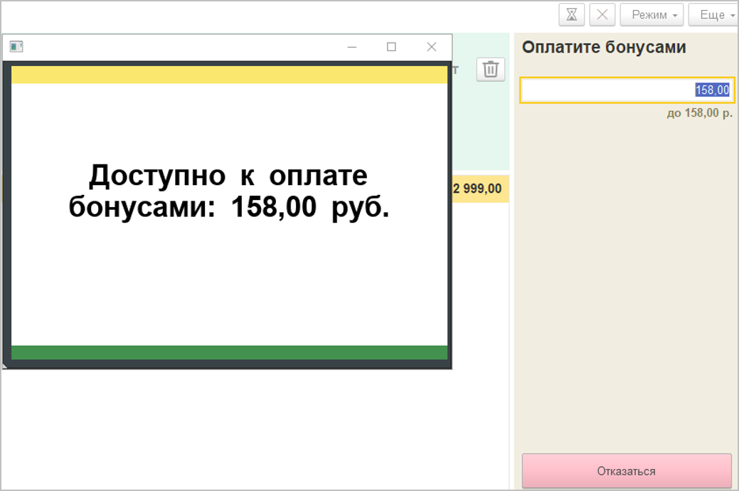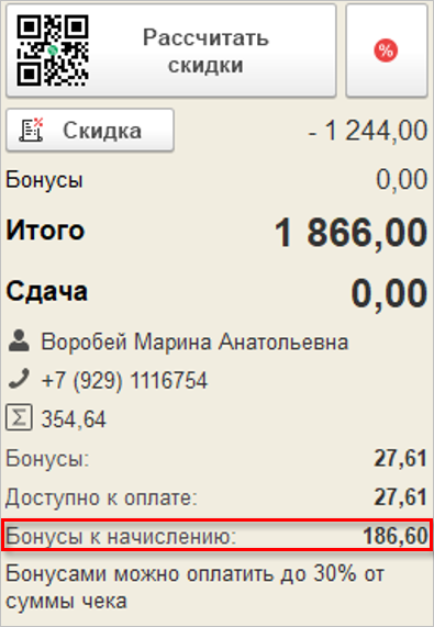 При этом в интерфейсе РМК сумма оплаты бонусами вводится сразу в рублях, количество списываемых при этом бонусом выводится справочно.