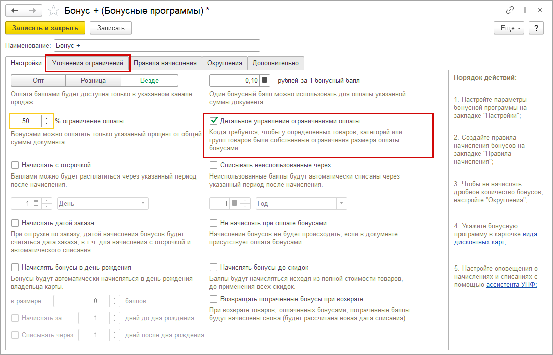 Для реализации этой возможности в настройки бонусной программы добавлена опция "Детальное управление ограничениями оплаты". При ее включении появляется вкладка "Уточнения ограничений".