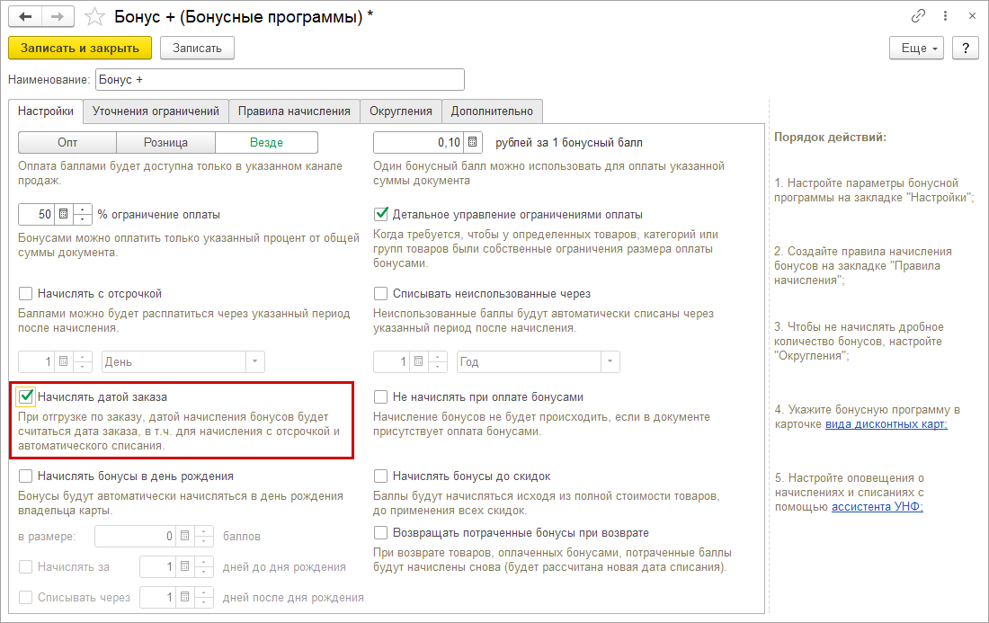 Теперь в настройках бонусных программ появился флажок "Начислять датой заказа".