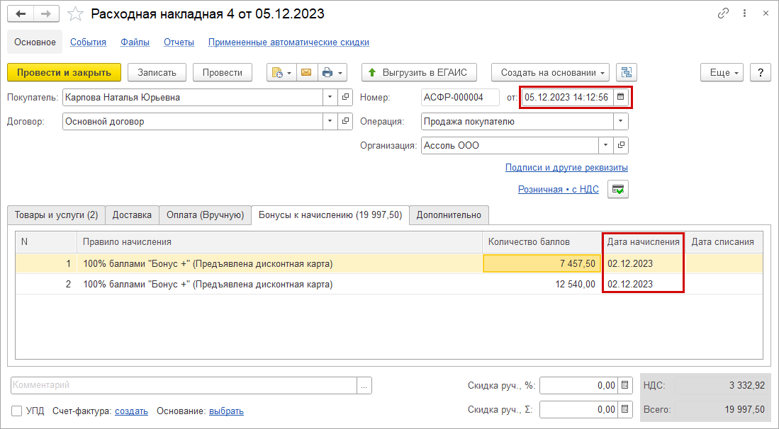 В предыдущих версиях программы начисление бонусных баллов выполнялось при проведении документа отгрузки, но датой начисления устанавливалась дата проведения заказа покупателя. Такой вариант начисления бонусов вызывал сложности в компаниях, где оформление заказа и фактическая отгрузка выполняются с большим временным интервалом.