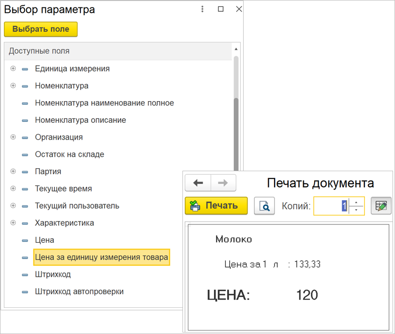 В списке доступных полей ценника появился параметр «Цена за единицу измерения товара», который позволит формировать ценники следующего вида: