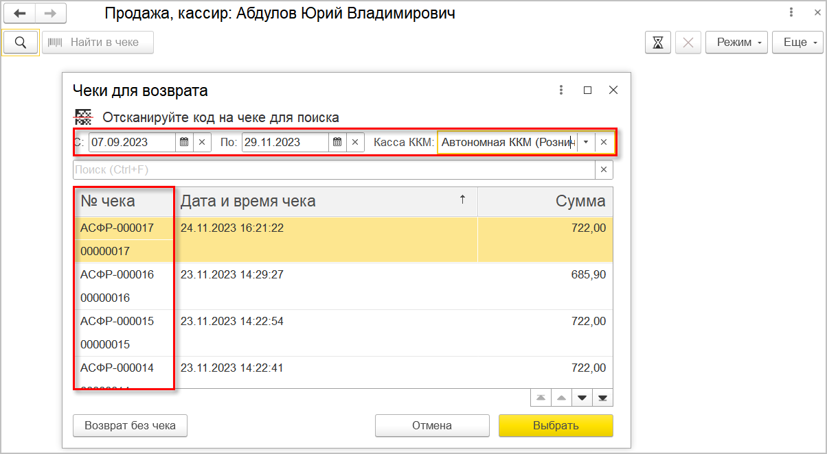 Сделали удобнее поиск отложенных чеков и чеков на возврат. Теперь при поиске можно задавать период и выбирать "Кассу ККМ" с сохранением указанного значения. Искать чек можно по номеру в программе и по номеру, присвоенному ККМ, в том числе с помощью поиска по строке.