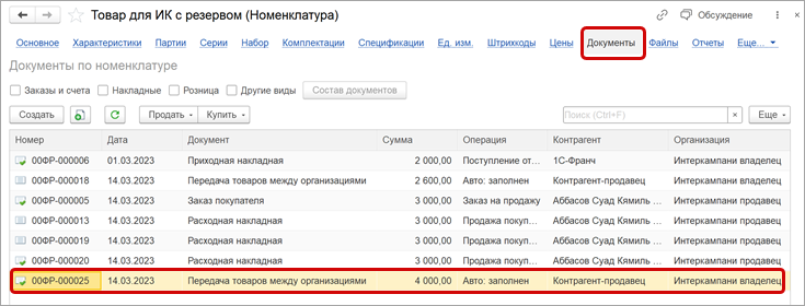 Резервирование. Товары одной организации можно зарезервировать под заказ другой с последующей перепродажей. Механизм передачи товаров по схеме интеркампани позволяет передавать зарезервированные товары. Например, если одна организация принимает заказы, а вторая закупает товары и ставит их под резерв заказа первой организации. В передаче товаров учитываются заказы покупателей. При заполнении резервов по команде или при вводе на основании также учитываются созданные передачи товаров.