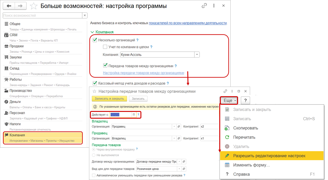 Настройки. Добавили возможность установить и редактировать дату начала действия каждой настройки интеркампани. Документы, созданные раньше указанной даты, не будут участвовать в передаче между организациями даже при повторном проведении.