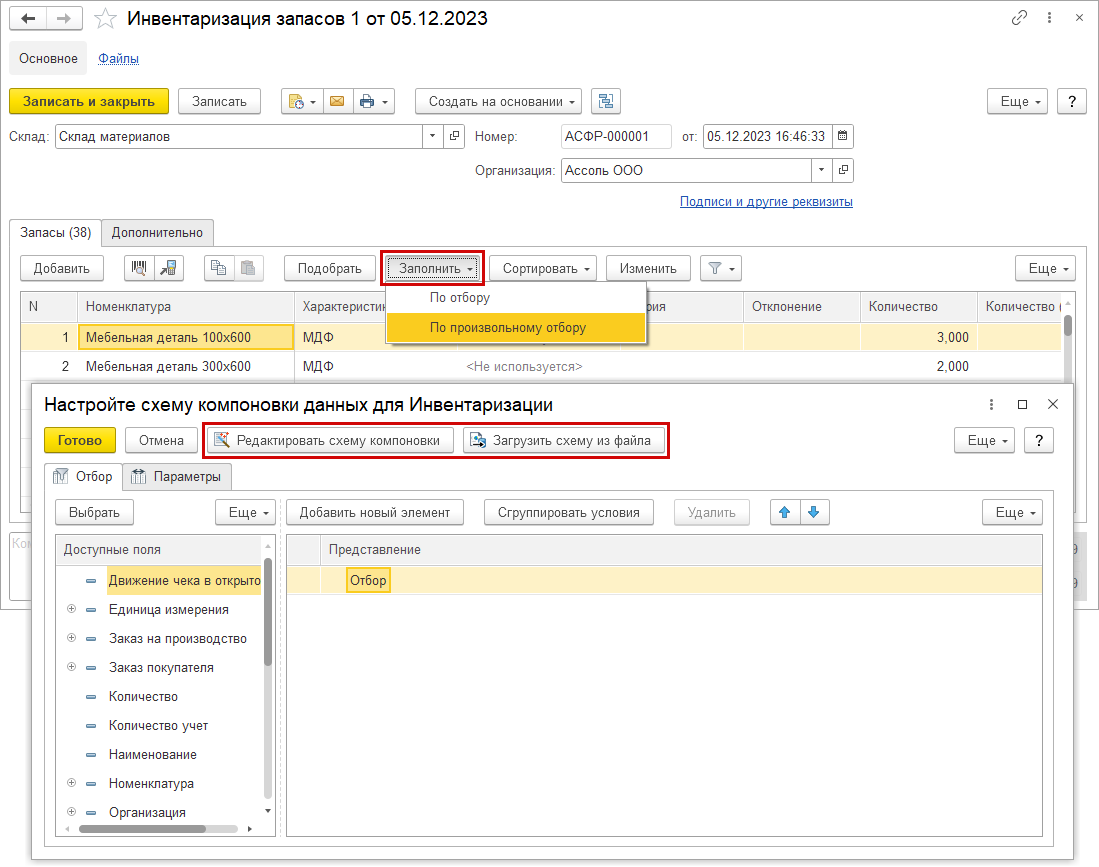 Теперь заполнить документ можно не только остатками, но и применить произвольный отбор.