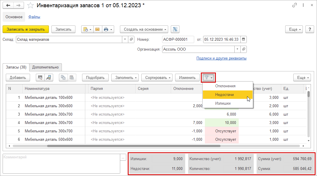 В документе с помощью фильтров теперь можно увидеть товары только с излишками, недостачами или с отклонениями.