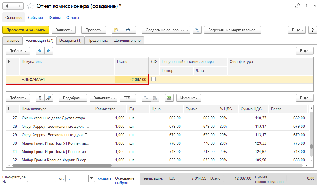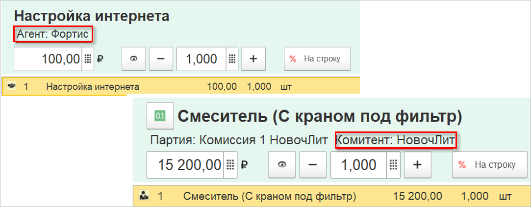 Дополнительно в строке текущего товара отображается статус контрагента "агент" или "комитент".