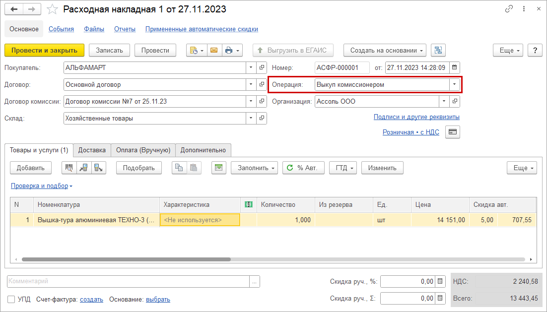 Для реализации в расходную накладную добавили операцию "Выкуп товаров комиссионером". Заполнить документ можно остатками у комиссионера.