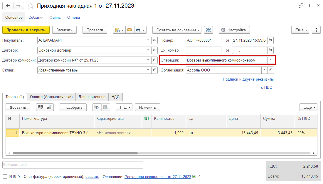 В документ "Приходная накладная" добавили операцию "Возврат выкупленного комиссионером" для оформления возврата выкупленного товара. Для операций доступен новый обязательный для заполнения реквизит "Договор комиссии".