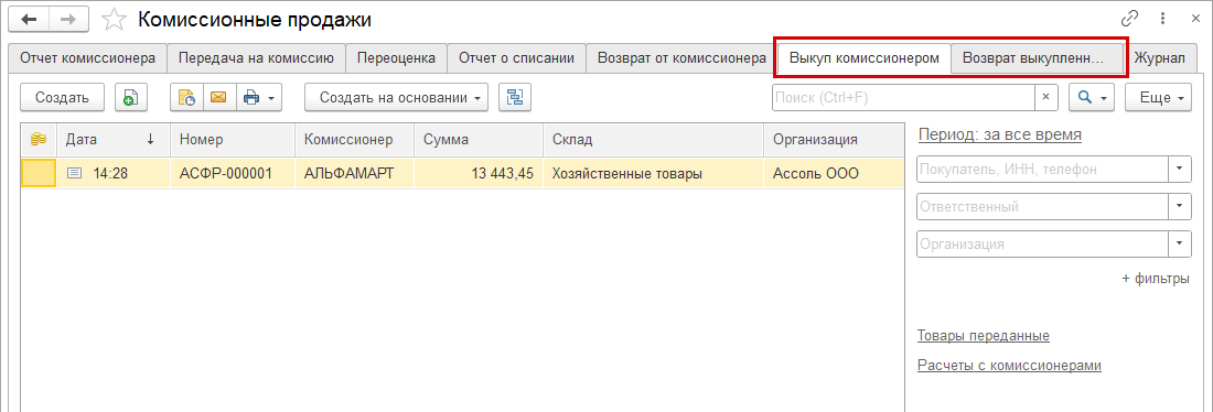 В журнале документов "Комиссионная торговля" появились страницы для новых операций.