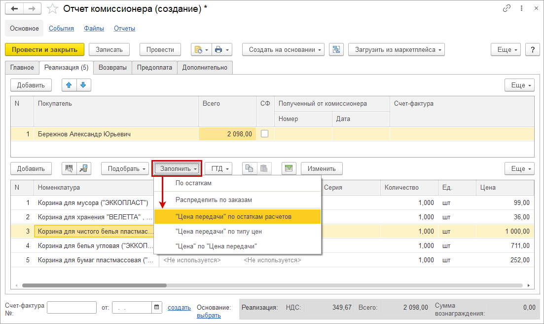 Список товаров к выкупу можно быстро заполнить остатками у комиссионера с помощью команды "Заполнить" - "По остаткам у комиссионера". В документ подставятся все товары, ранее переданные на реализацию этому комиссионеру.