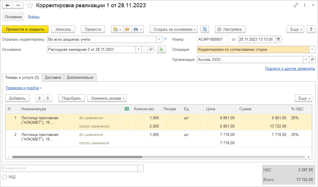 Печатная форма счета-фактуры документа "Корректировка реализации" совпадает с видом аналогичной печатной формы в 1С:Бухгалтерии в части номера и даты первичного документа, номера и даты исправительного документа.
