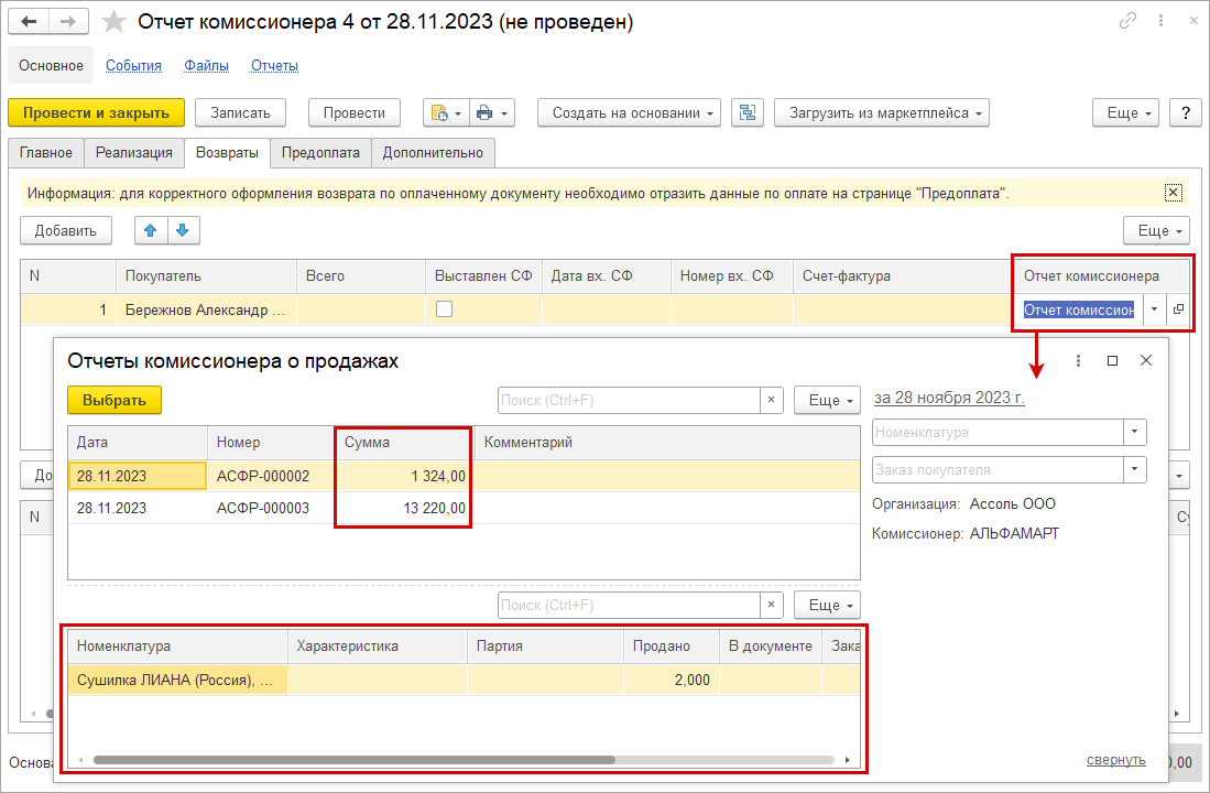 В ней отображаются все отчеты комиссионера, по которым существует остаток, состав документов, доступное к возврату и уже подобранное количество номенклатуры.