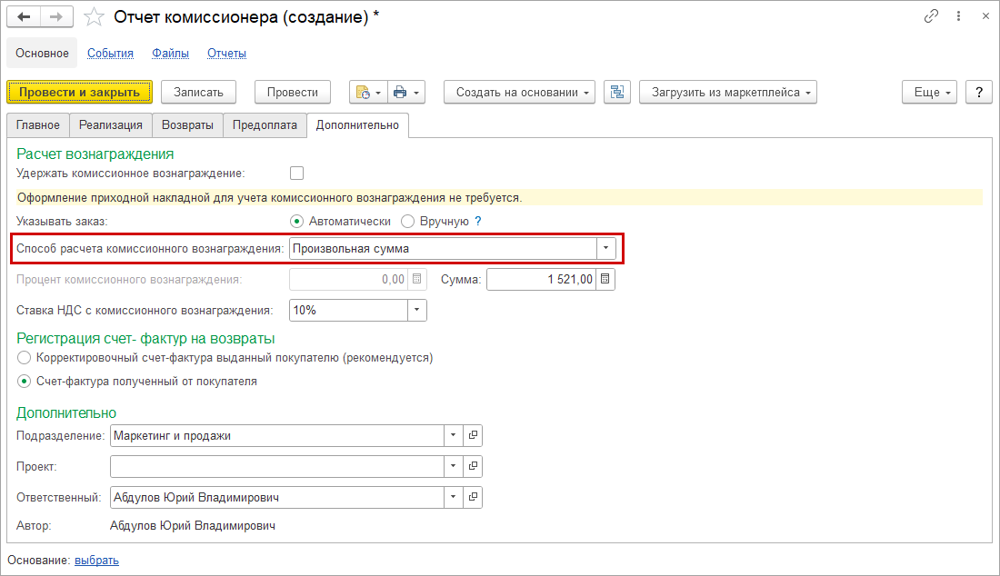 Для этого в документы "Отчет комиссионера" и "Отчет комитенту" на вкладку "Дополнительно" добавили новый способ расчета комиссионного вознаграждения "Произвольная сумма".