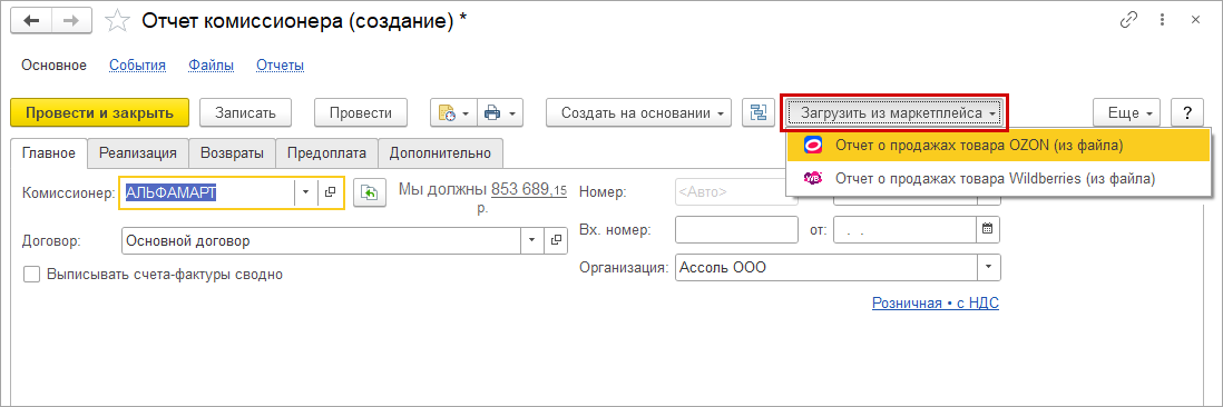 Для загрузки отчета из файла маркетплейса создаем новый документ "Отчет комиссионера" и нажимаем на кнопку "Загрузить из маркетплейса".