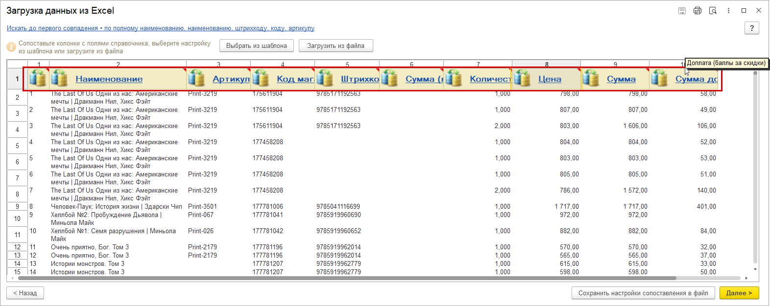 После считывания файла наименования колонок определяются автоматически, сразу подставляются в шапку загрузки и доступны для ручной настройки.