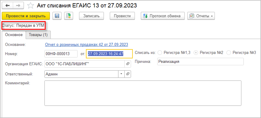 Добавили возможность автоматически отправлять "Акт списания ЕГАИС" для немаркируемой алкогольной продукции. Документ сформируется при закрытии кассовой смены, если в настройках интеграции с ЕГАИС предварительно включить опцию "Выгружать продажи немаркируемой продукции в ЕГАИС". "Актов списания ЕГАИС" может быть несколько в зависимости от данных об остатках алкогольной продукции. После закрытия смены каждый документ автоматически будет подготовлен к передаче в УТМ.