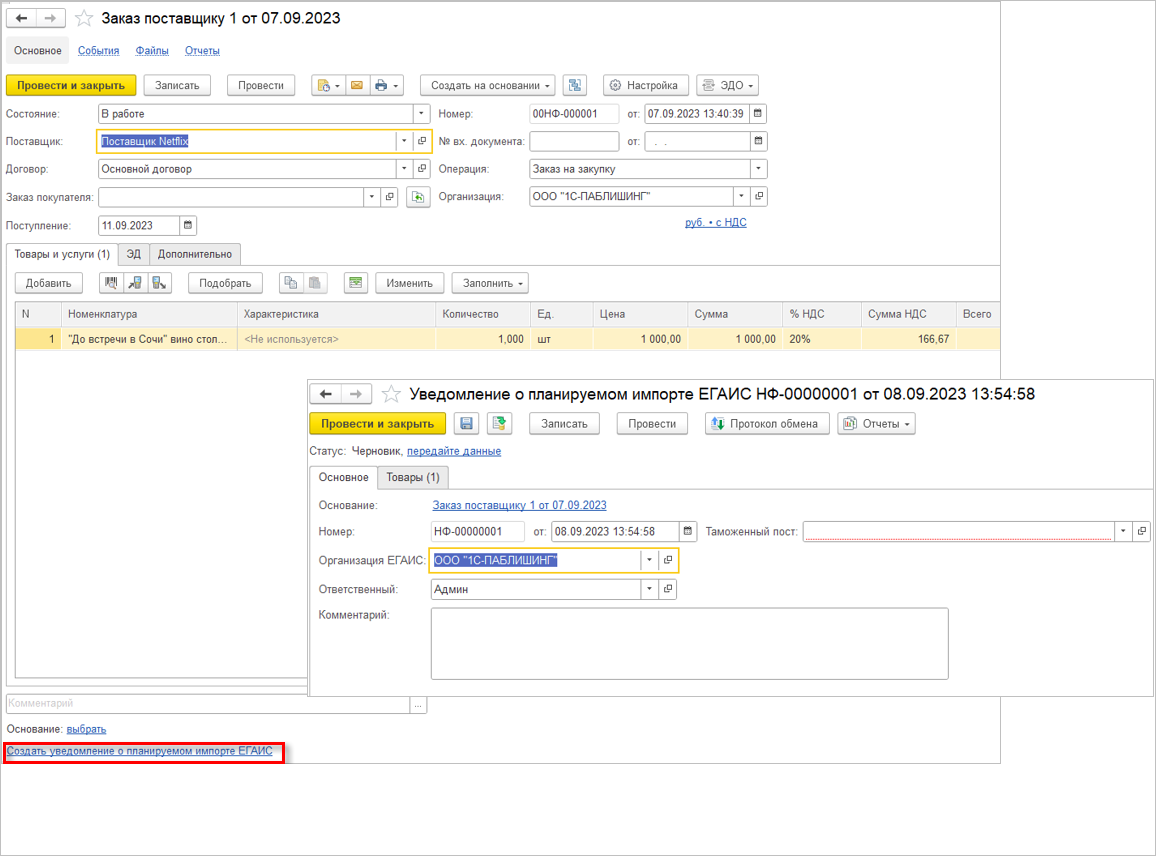 При оформлении заказа алкогольной продукции у импортного поставщика автоматически будет сформирована гиперссылка "Создать уведомление о планируемом импорте ЕГАИС", а также запись "Оформите" в панели обмена с ЕГАИС. Документ "Отчет об импорте ЕГАИС" потребуется создать вручную.