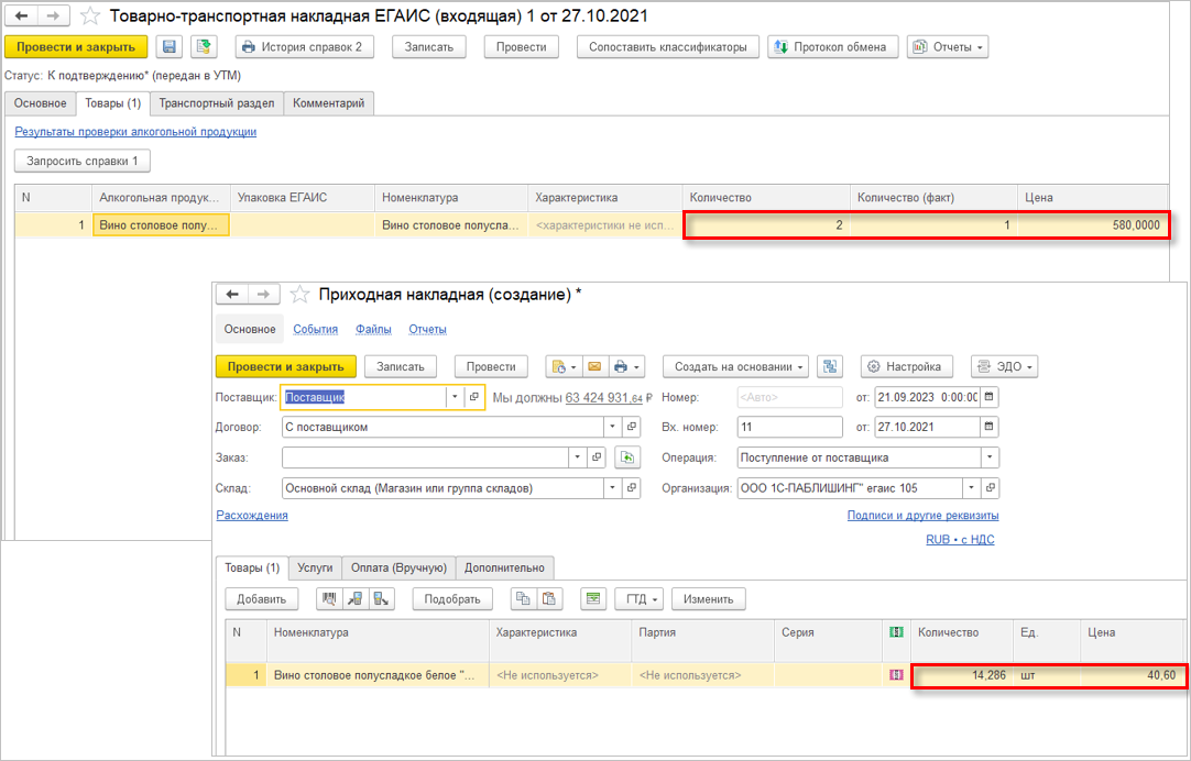 Автоматизировали пересчет количества алкогольной продукции при поступлении. В "ТТН Входящей ЕГАИС", содержащей неупакованную алкогольную продукцию, количество указывается в декалитрах, но номенклатура может иметь другую единицу измерения, например, штуки или кеги. В связи с этим теперь при формировании "Приходной накладной" на основании "ТТН Входящей ЕГАИС" количество и цена пересчитываются исходя из объема, указанного в карточке номенклатуры.