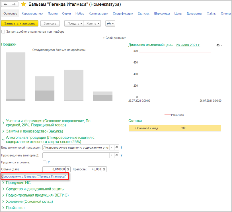 В карточке номенклатуры отображается информация о сопоставленной алкогольной продукции. По одноименной гиперссылке можно быстро перейти к списку сопоставленных карточек и отредактировать данные. Если алкогольная продукция не сопоставлена, то гиперссылка будет отображаться красным цветом.