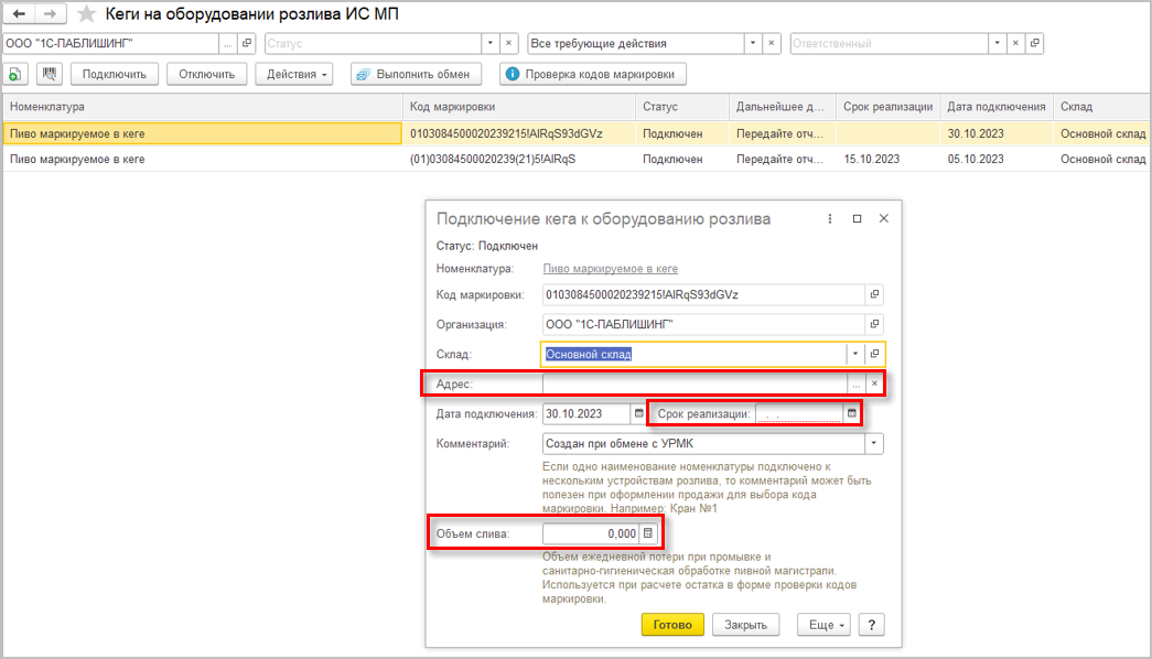 Если коды маркировки еще не подключали, то подключение произойдет автоматически. При отключении кеги выбираем код маркировки из ранее подключенных.