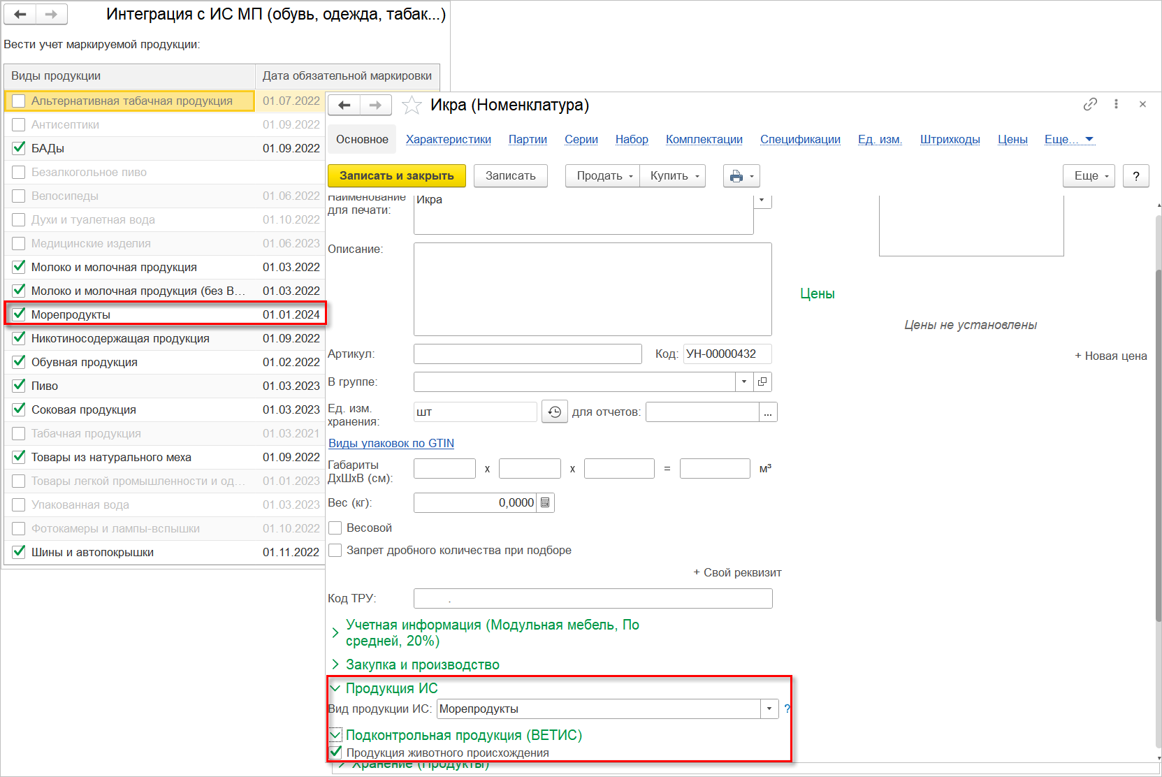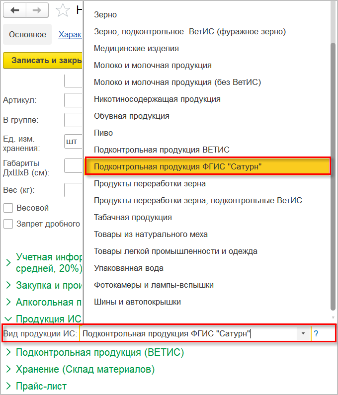 Для номенклатуры устанавливаем реквизит "Вид продукции ИС" - "Подконтрольная продукция ФГИС "Сатурн".