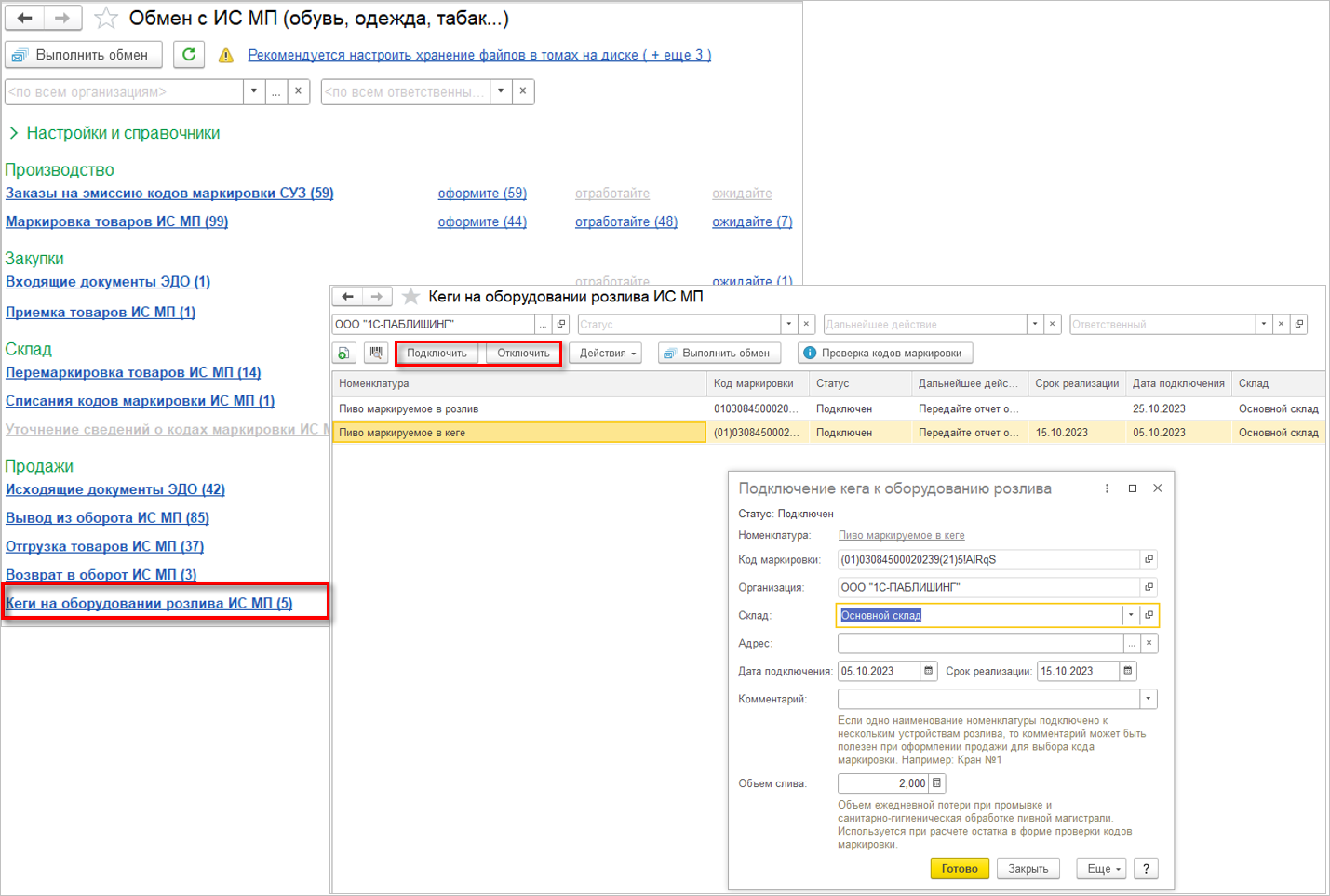 Постановка кега на кран. Сделали автоматическим формирование записей о подключении кега к оборудованию розлива при синхронизации с 1С:РМК. Данные сформируются, если поступила информация о продаже пивной продукции, имеющей признак "Продается в розлив". Также запись будет создана, если заполнена информация о частичном выбытии в табличной части "Акцизные марки" документа "Чек ККМ". После синхронизации соответствующие документы "Кеги на оборудовании розлива ИС МП" отобразятся "к отработке" в рабочем месте "Обмен с ИС МП".