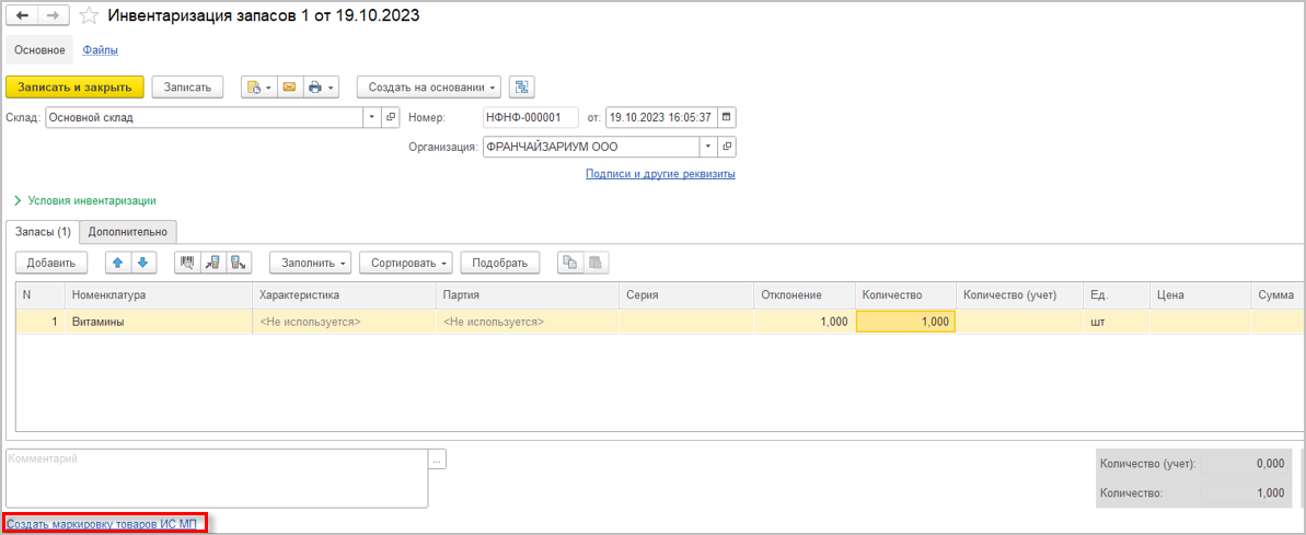 Теперь при формировании документов ИС МП автоматически заполняется количество кодов маркировки исходя из настроенных параметров номенклатуры ИС МП.