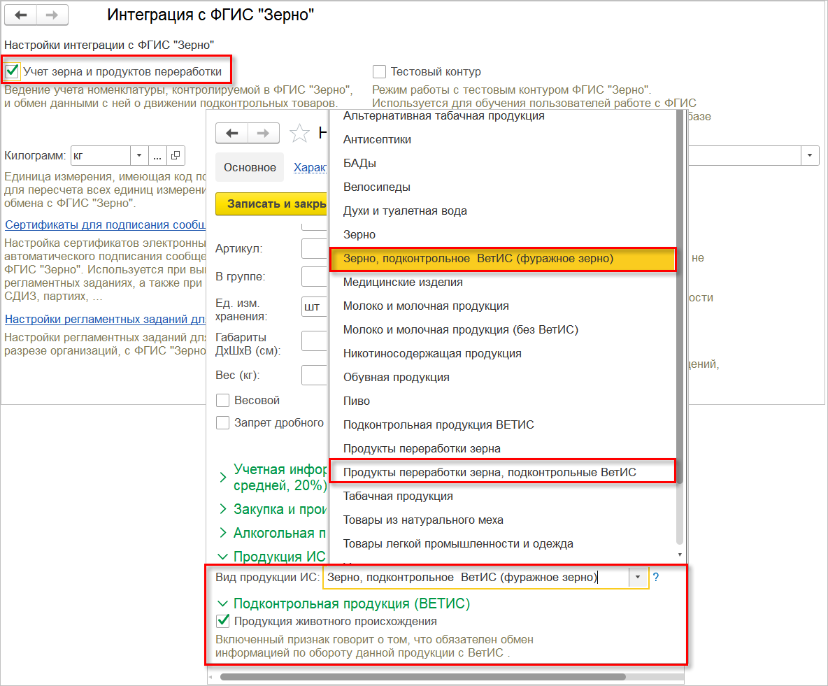 Добавлены новые виды продукции для зерна: "Зерно, подконтрольное ВетИС (фуражное зерно)", "Продукты переработки зерна, подконтрольные ВетИС". Новые виды продукции подлежат контролю ВЕТИС. Доступны для выбора в категории номенклатуры и карточке номенклатуры в поле "Вид продукции ИС" при активной интеграции с ФГИС "Зерно" и "ВЕТИС".