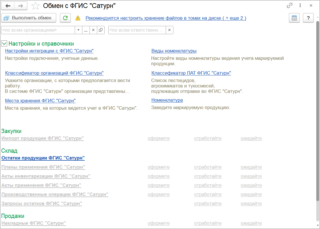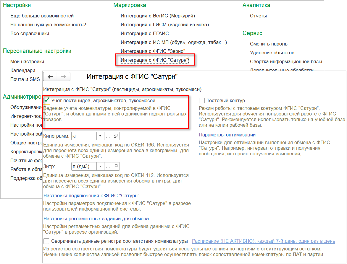 Появилась интеграция с ФГИС "САТУРН": учет пестицидов, агрохимикатов, тукосмесей. Включается в разделе настройки.