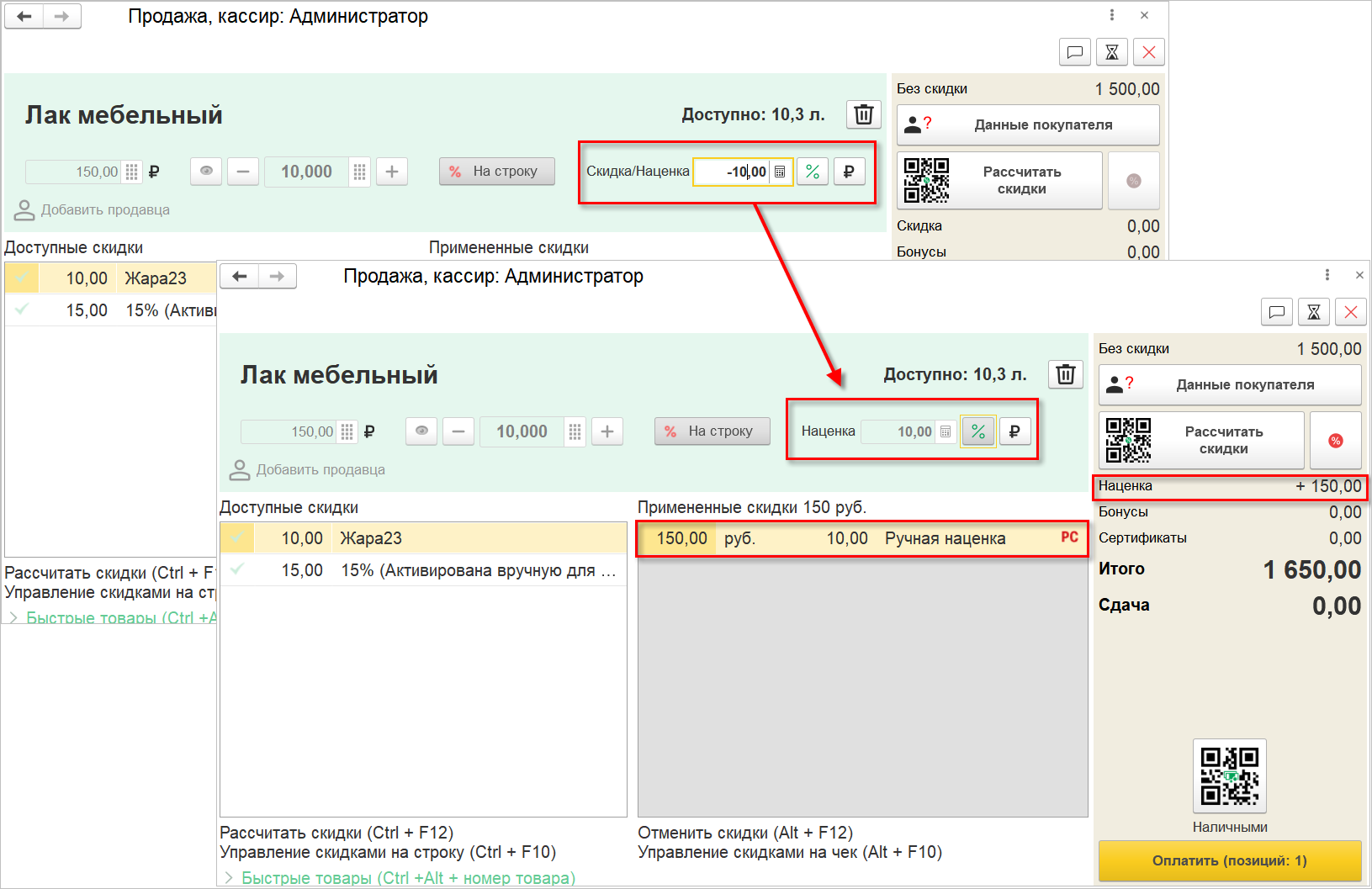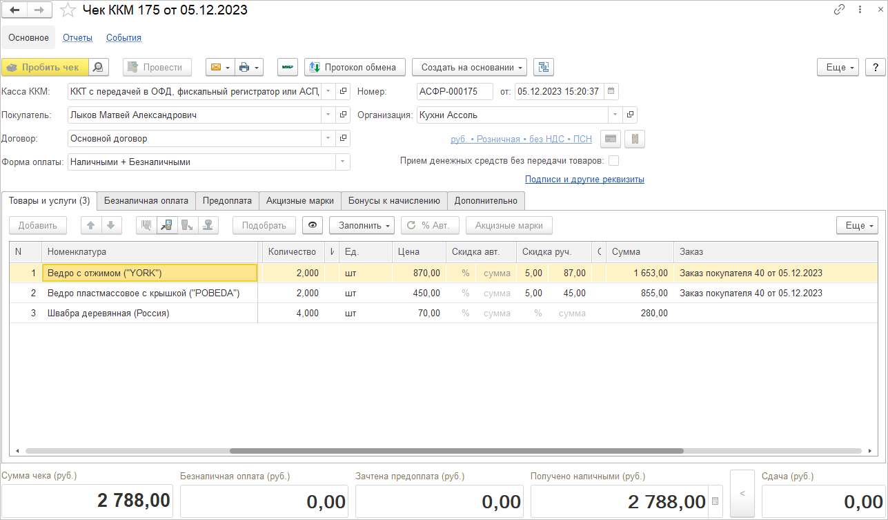 Загрузка чеков "сверх" заказа покупателя. Реализовали загрузку чеков ККМ из 1С:РМК при оформлении продажи "сверх" первоначального заказа покупателя, принятого из программы. После загрузки Чека ККМ в управляющую систему соответствующий заказ покупателя будет корректно закрыт, а добавленные позиции будут учтены как продажа без заказа. При настроенном сервере лояльности расчет скидок чека ККМ в 1С:РМК, оформленном по заказу покупателя, также происходит в управляющей системе. Сумма скидки по строкам из заказа покупателя корректируется пропорционально количеству, а по добавленным позициям рассчитывается по действующим автоматическим скидкам.