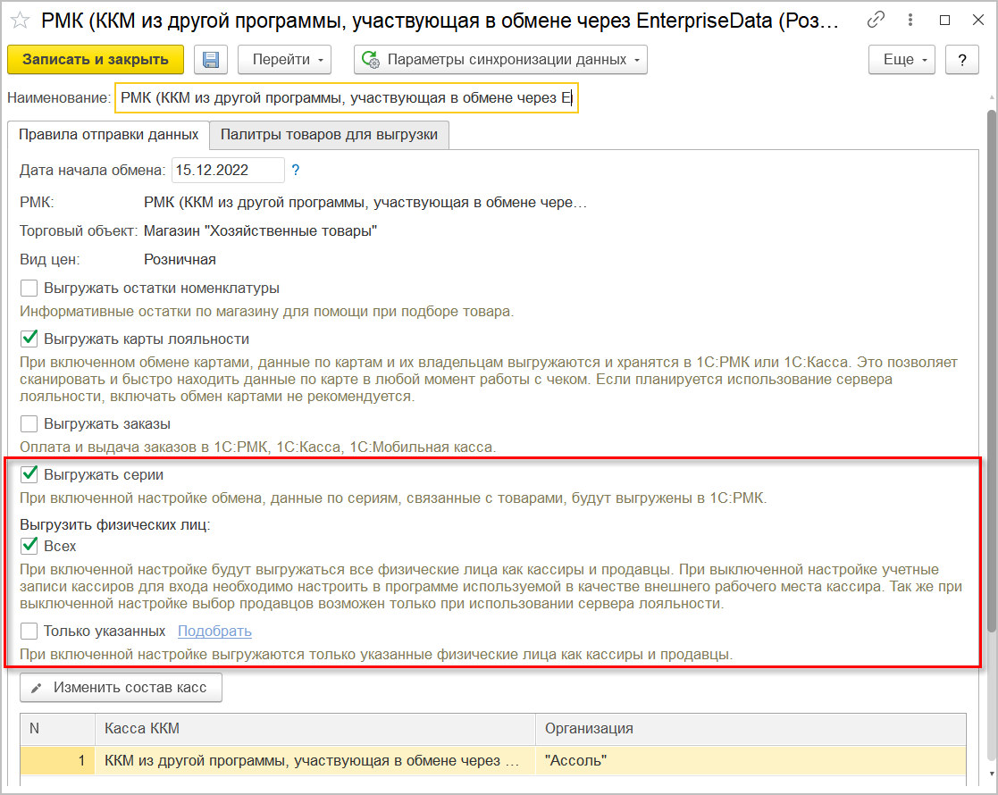 Ограничение выгрузки серий, физических лиц. В настройку обмена с программой 1С:РМК добавили возможность регулировать выгрузку серий номенклатуры и физических лиц. Чтобы не утяжелять базу 1С:РМК можно частично или полностью отключить регистрацию к обмену этих справочников, а в самом 1С:РМК получать данные через сервер лояльности. После синхронизации данных в загруженных из 1С:РМК документах такие реквизиты, как «серия», «ответственный», «автор» будут заполнены автоматически по идентификатору, присвоенному в 1С:РМК.