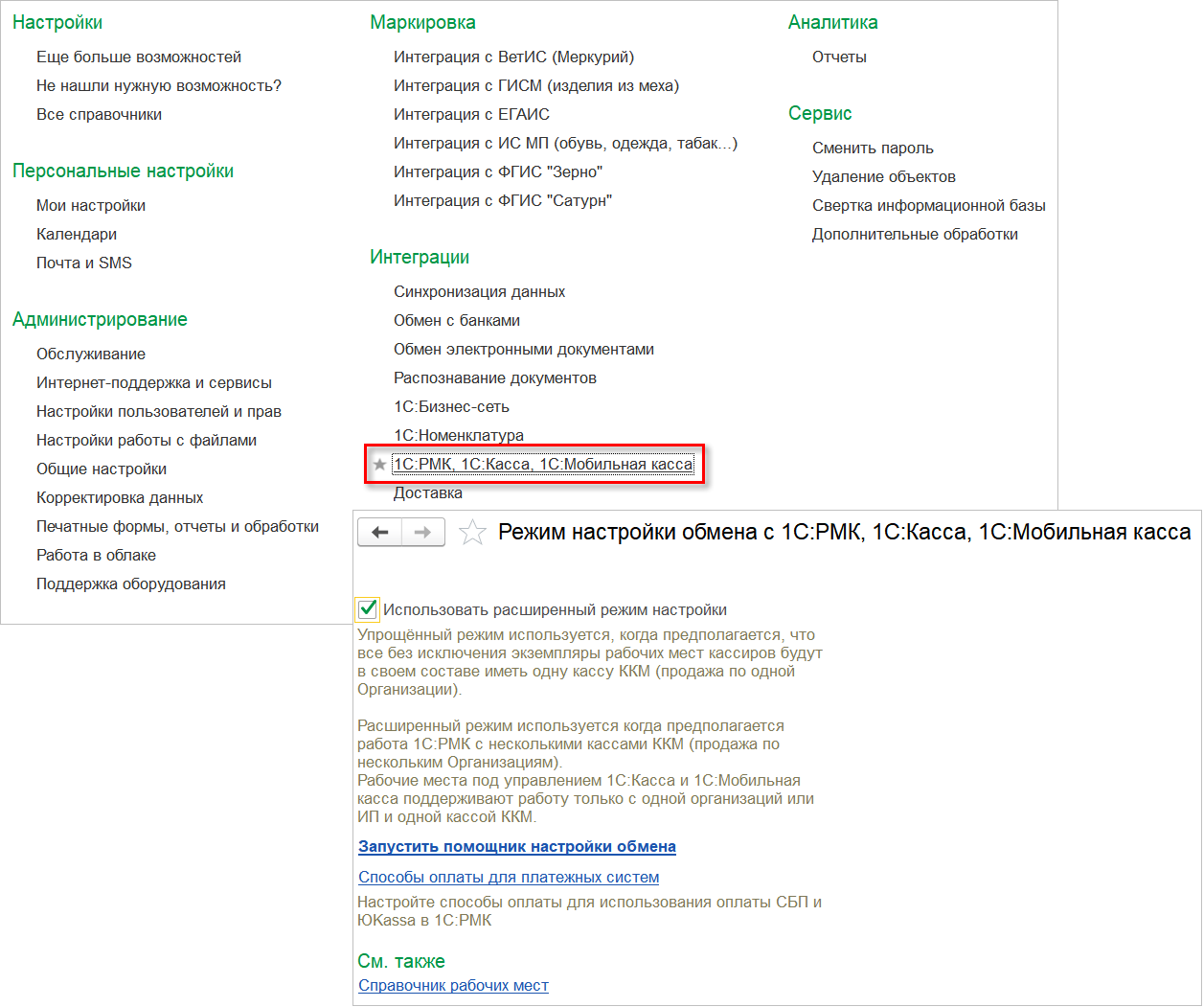 СБП и ЮKassa. Упростили заполнение настроек СБП и ЮKassa в помощнике подключения кассового места. Добавили новый признак "Использовать оплату платежными системами", который автоматически заполняется для существующих настроек. С помощью подсказок программы можно быстро настроить платежные системы. Интерфейс подключения кассовых ссылок стал более понятным.