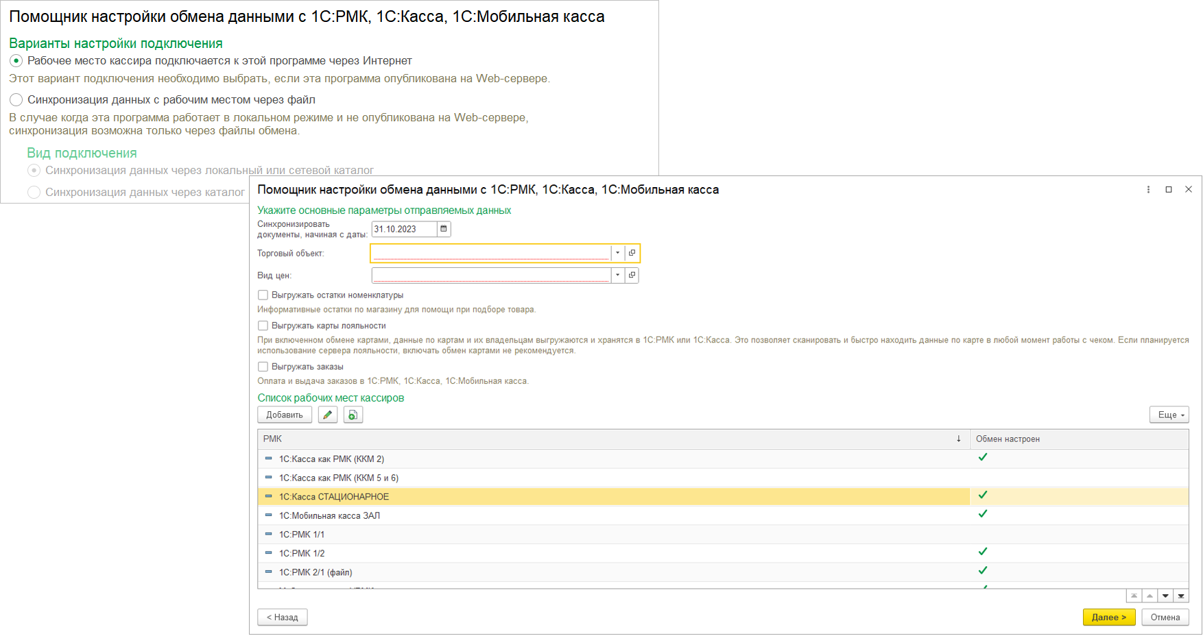 Появилась возможность подключать к программе 1С:Кассу, 1С:Мобильную кассу по аналогии с 1С:РМК. Для этого в 1С:Касса с версии 4.0.8 и 1С:Мобильная касса с версии 3.19 поддержан обмен по аналогии с 1С:РМК.