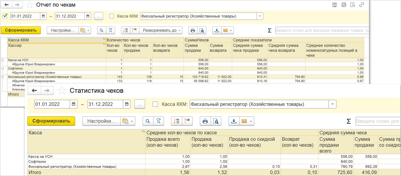 В отчете по чекам представлена информация о количестве и сумме чеков, величине среднего чека. В отчете "Статистика чеков" добавляется информация по каждой кассе и виду оплаты.