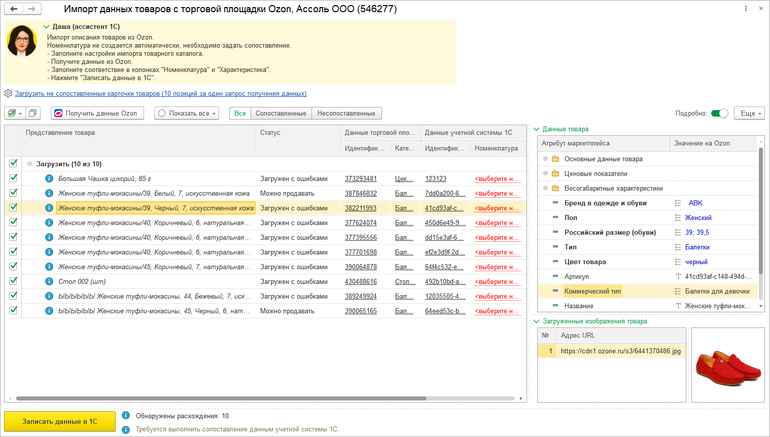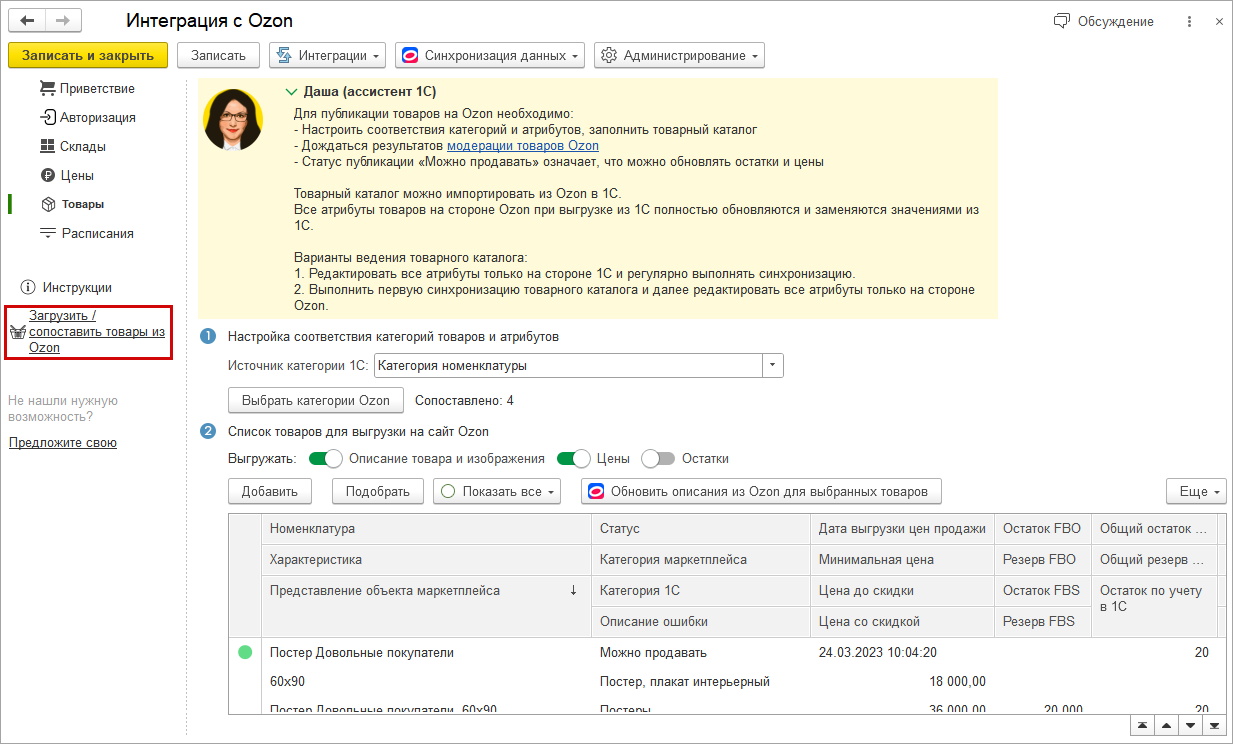 Также предусмотрена возможность сопоставить и актуализировать карточки товаров, ранее введенные в 1С.