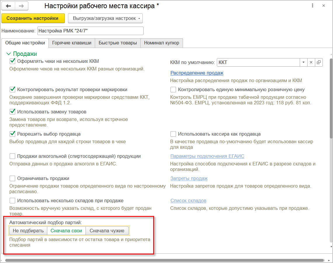 Дополнительно можно устанавливать значение по умолчанию, если авторизованный кассир является продавцом. Для этого должен быть установлен одноименный флажок в разделе "Продажи" настроек РМК.