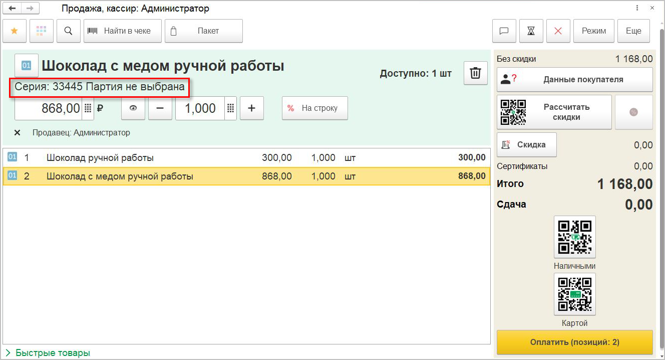 Автоматически при продаже подставляется код маркировки, если он единственный для сорта пива, иначе предлагается выбрать из списка. Коды в других строках таблицы "Товары" будут недоступны для подбора. В представлении кода после наименования товара доступен комментарий из документа подключения кега. Значок кода отображается серым до перехода к оплате и проверке кода, а после проверки - зеленым. Для сорта пива без подключенного кода маркировки будет предложена форма подключения.