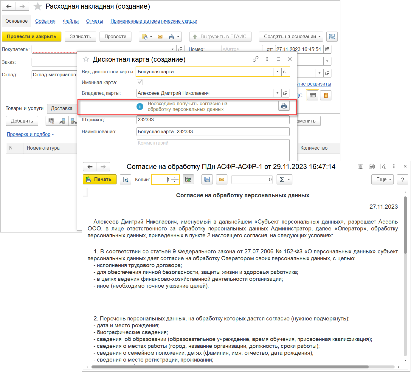 На форме проверки реквизитов дисконтной карты выводится сообщение о необходимости получить письменное согласие на обработку персональных данных и кнопка печати бланка. Субъектом разрешения в документе автоматически будет указан владелец дисконтной карты.