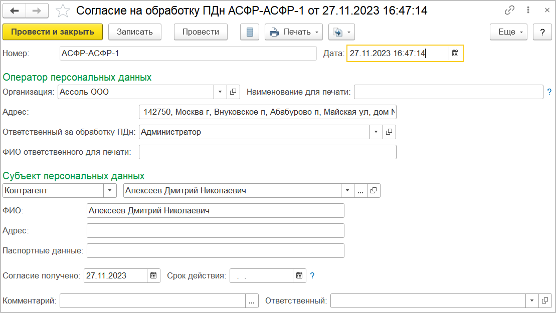 Созданный документ "Согласие на обработку ПДн" автоматически сохраняется в одноименном журнале документов раздела "Персонал" и группе "Персональные данные" карточки покупателя. Здесь же можно создать "Отзыв согласия на обработку ПДн".