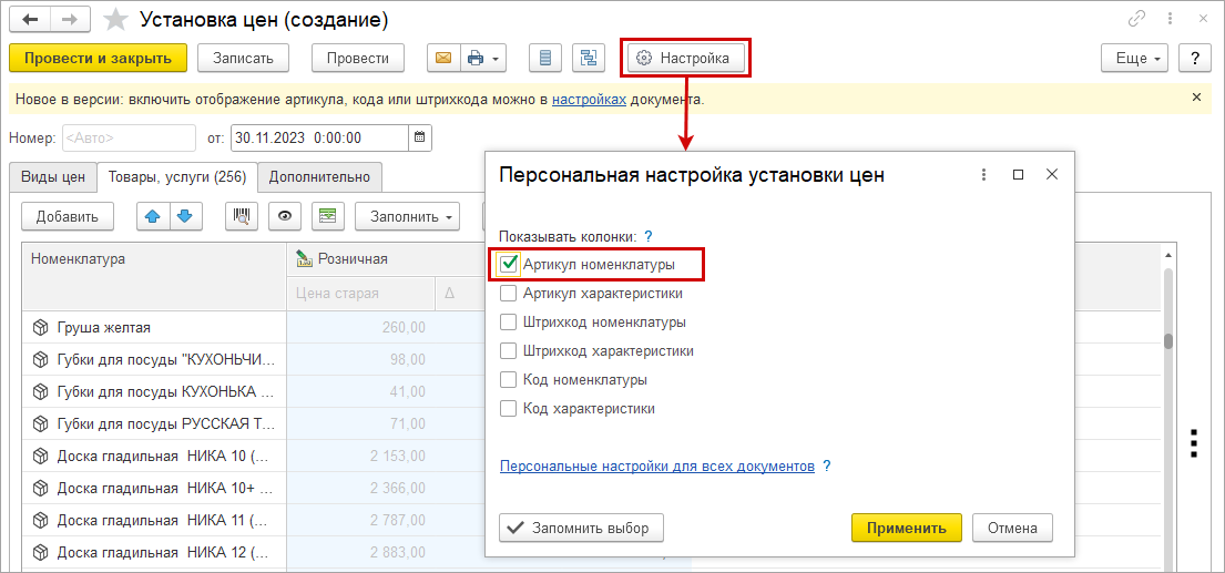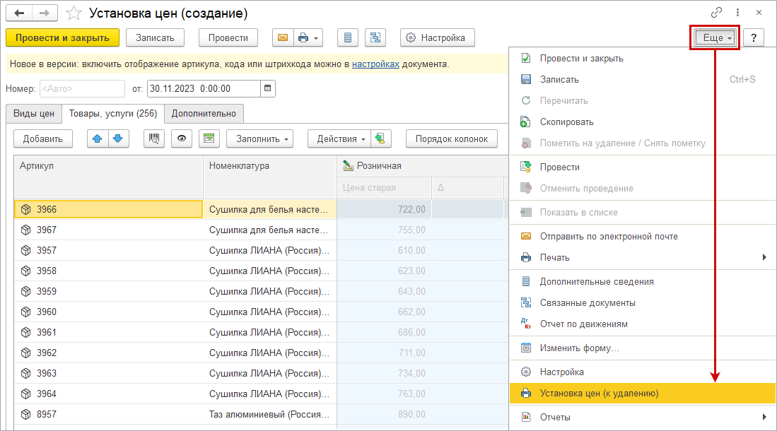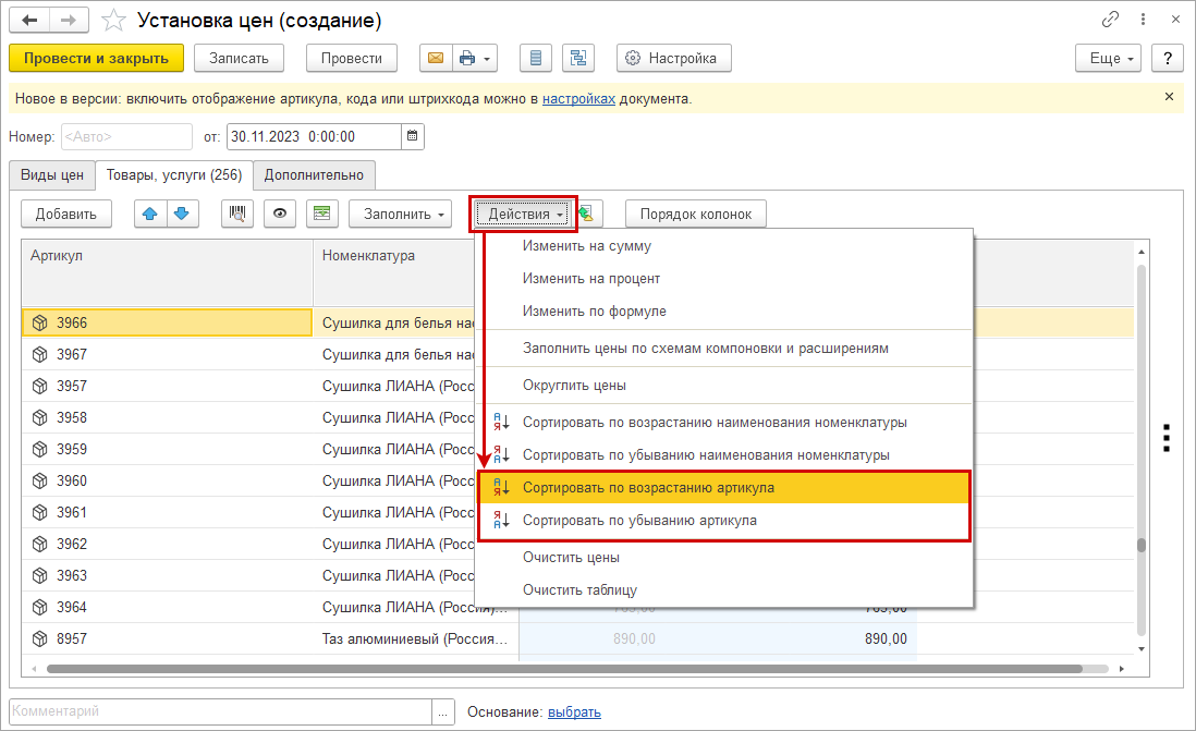 В документе "Установка цен" доступна сортировка по возрастанию либо убыванию артикулов.