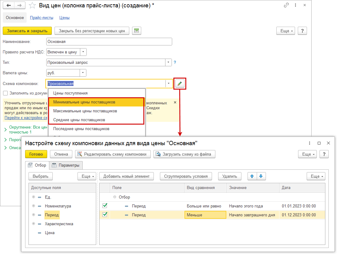 Для более гибкого ценообразования добавили возможность расчета цен по схемам компоновки данных за произвольный период. Установить период можно для схем компоновки: минимальные, максимальные и средние цены поставщиков.