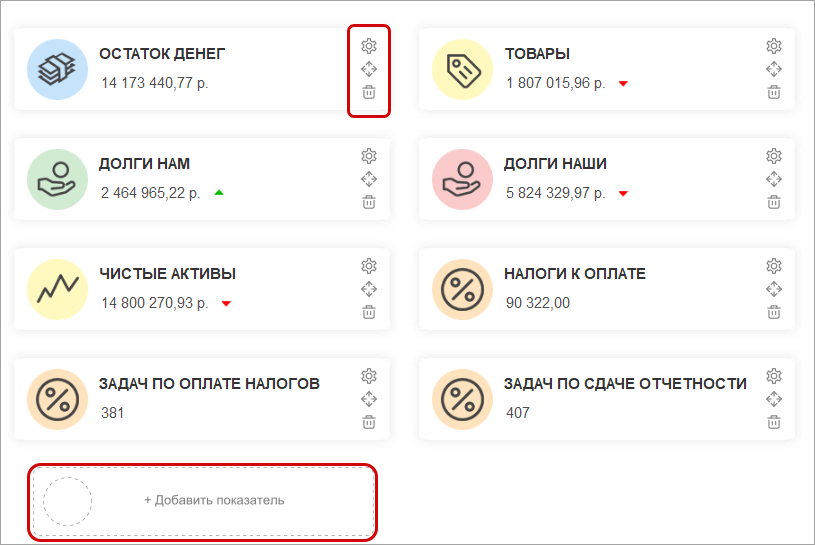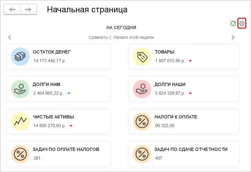 Оценить ключевые показатели как по бизнесу в целом, так и по каждой организации отдельно теперь можно оперативно без дополнительных настроек. На стартовой странице "Пульс бизнеса" появилась возможность быстро переключаться между информацией разных организаций. Можно выбрать, как видеть показатели на экране: по всем организациям или только по выбранной. Стало удобнее настраивать "Пульс бизнеса". Появился режим настройки.