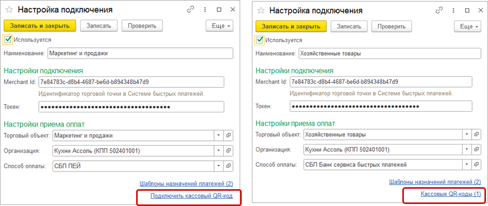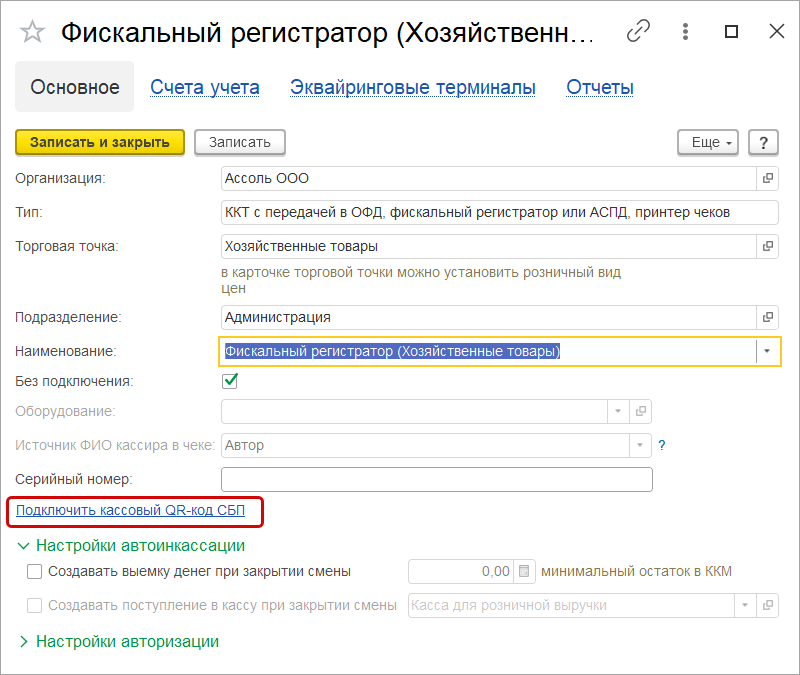 В карточке кассы ККМ добавили ссылку с возможностью подключения кассового QR-кода для этой кассы или перехода к уже существующему подключению.