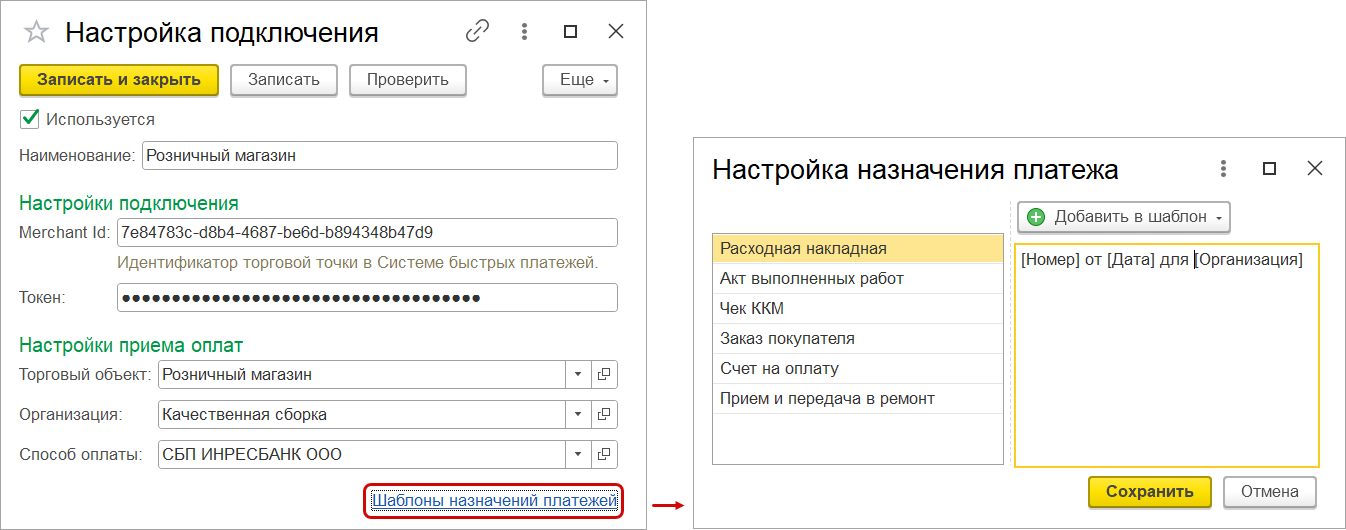 Появилась возможность настраивать назначение платежа при приеме оплаты по СБП. В форме подключения создаем шаблон для назначения платежа.
