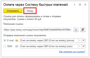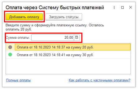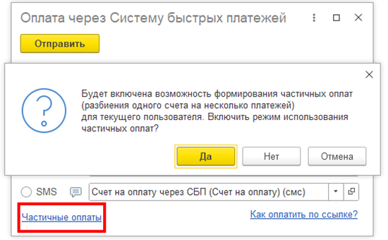 Теперь формировать QR-код для оплаты СБП можно на часть суммы заказа или счета. Для этого на форме подготовки платежной ссылки используем команду "Частичные оплаты".