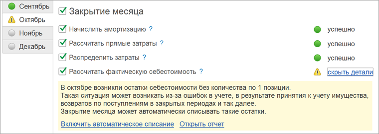 При переходе по ссылке "Включить автоматическое списание" новая возможность становится активной, выполняется снова закрытие месяца и суммы без количества списываются на прочие расходы.